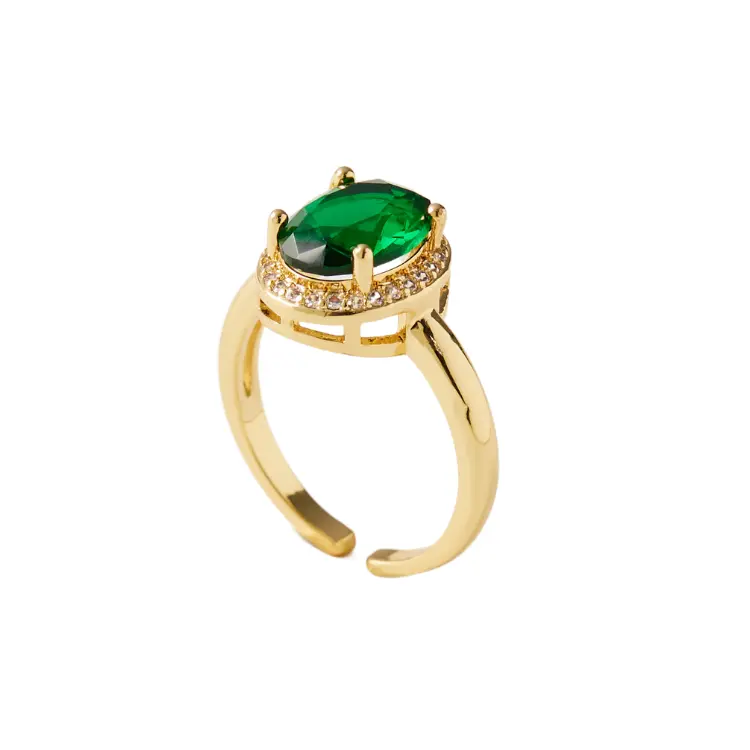 Anillo dorado con piedra verde rodeada de circones. Es graduable y se ajusta a cualquier tamaño de dedo.