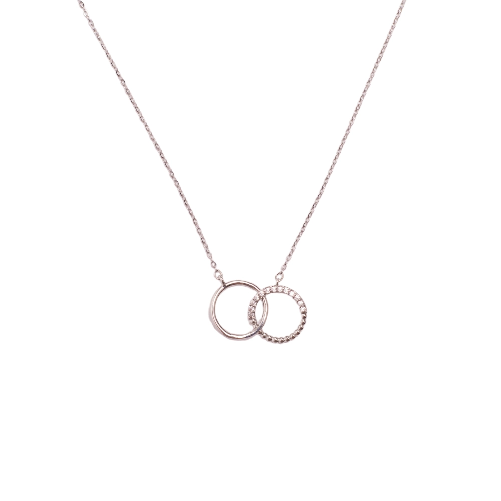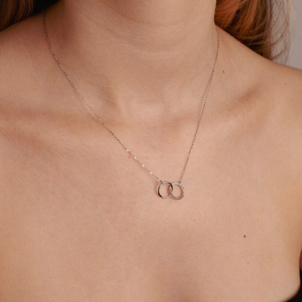 La sencillez hecha accesorio. La cadena Lume se luce con su diseño delicado y minimalista, protagonizado por dos dijes de círculos entrelazados que simbolizan conexión y equilibrio. Un toque moderno y atemporal para complementar cualquier estilo con sutileza.